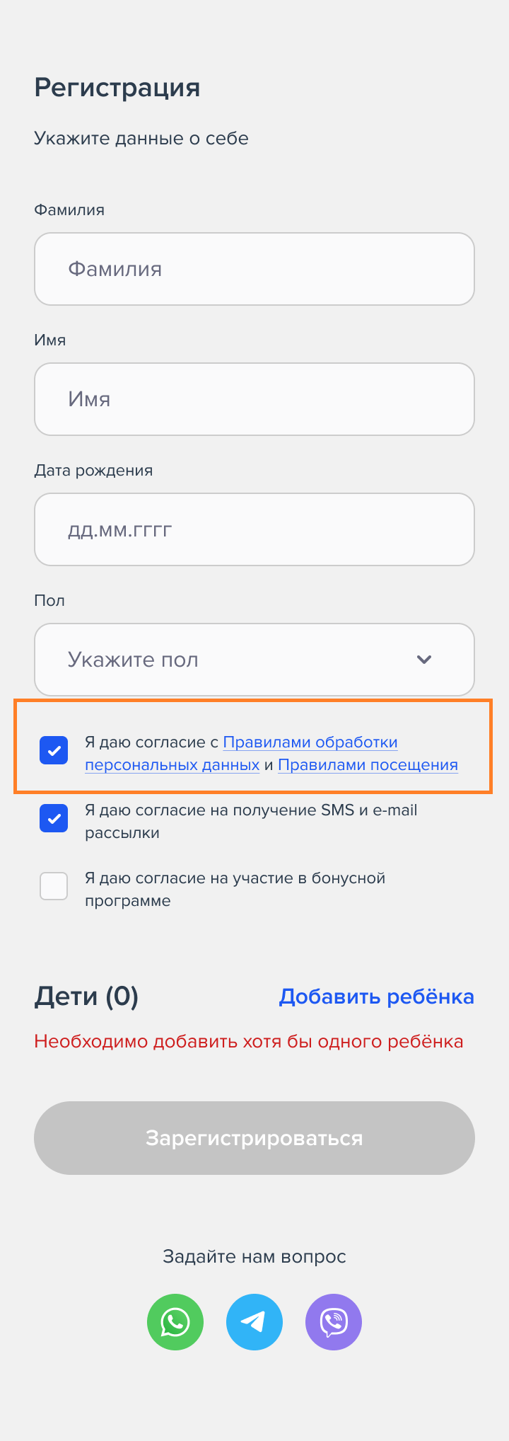 Рис. 1 Подтверждение согласия с правилами парка при регистрации нового гостя.