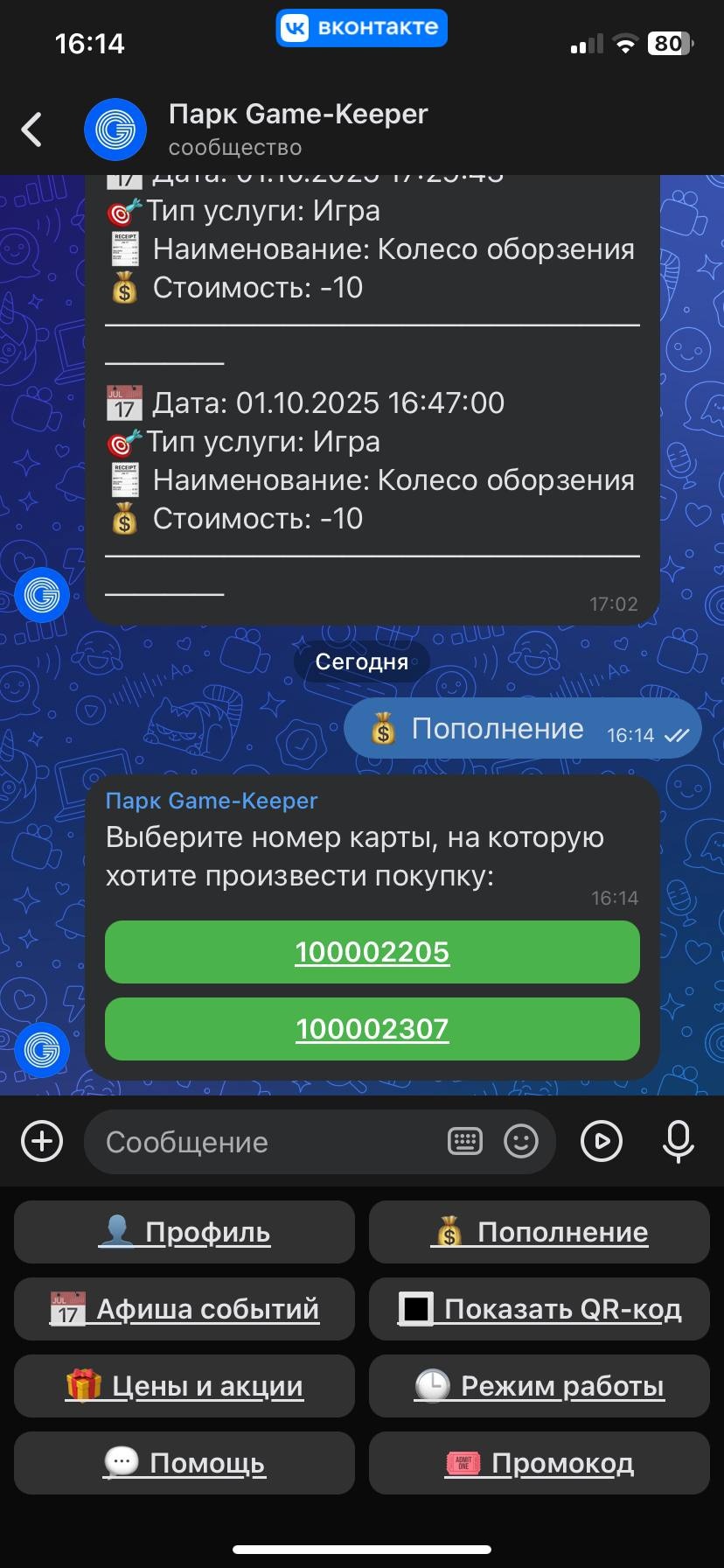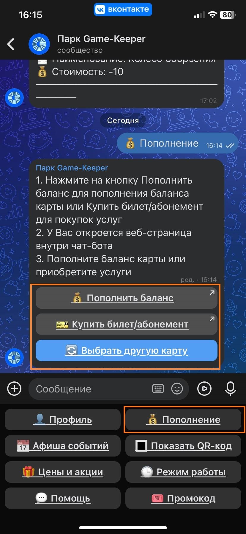 3. Появится кнопка Пополнить баланс и/или Купить билет/абонемент, нажмите и у вас откроется ссылка внутри телеграмм бота.