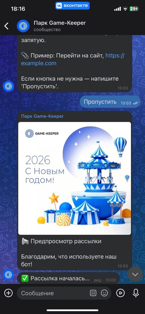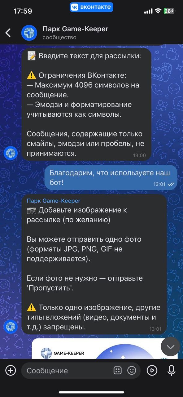 У VK при отправке массовых рассылок через бот, есть ограничение на длину сообщения: