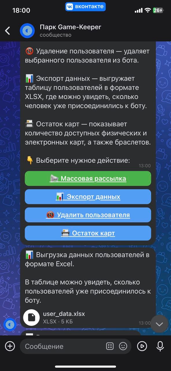 - Экспорт данных - позволяет выгрузить данные пользователей зарегистрированных в боте в формате xlsx (см. Рис. 41).