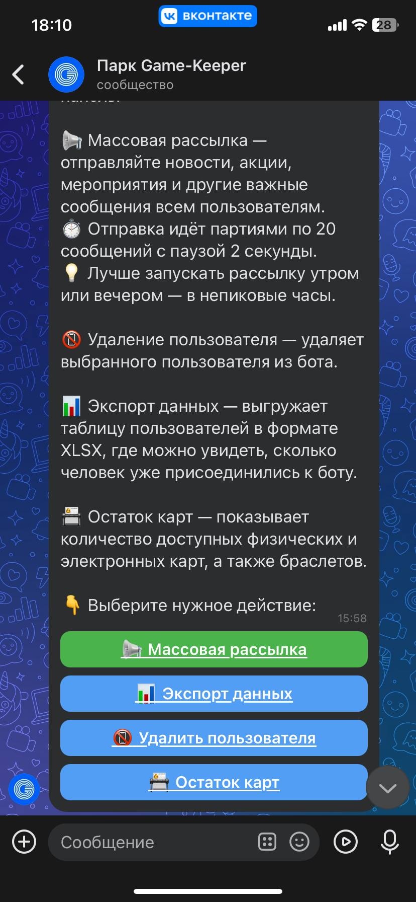 - Массовая рассылка - позволяет отправлять рассылки , такие как мастер-классы, акции, мероприятия и другие важные сообщения всем пользователям, зарегистрированным в данном боте (см. Рис. 38-39).