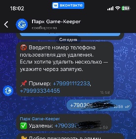 Так же рассылки лучше делать не в самый пик взаимодействия пользователей с ботом, иначе Telegram может на определённое время заблокировать запрос боту. - Удаление пользователя - позволяет удалить пользователя телеграмм бота по номеру телефона. Данная функция используется, когда гость попросил удалить его персональные данные, которые он вводил при регистрации (см. Рис. 40).