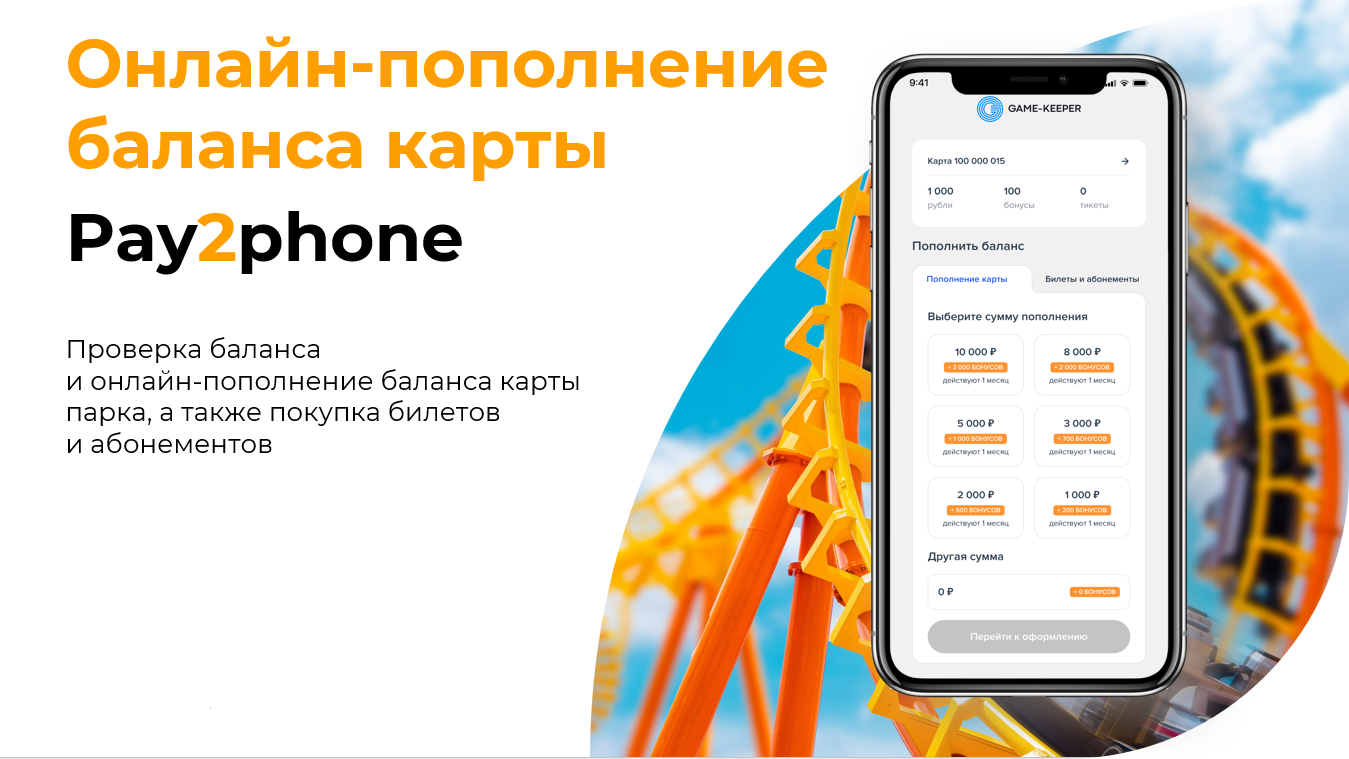 Pay2Phone — это сервис, который позволяет гостям развлекательного центра самостоятельно покупать билеты, абонементы, тарифы и дополнительные услуги, а также онлайн пополнять баланс игровой карты прямо со своего смартфона.