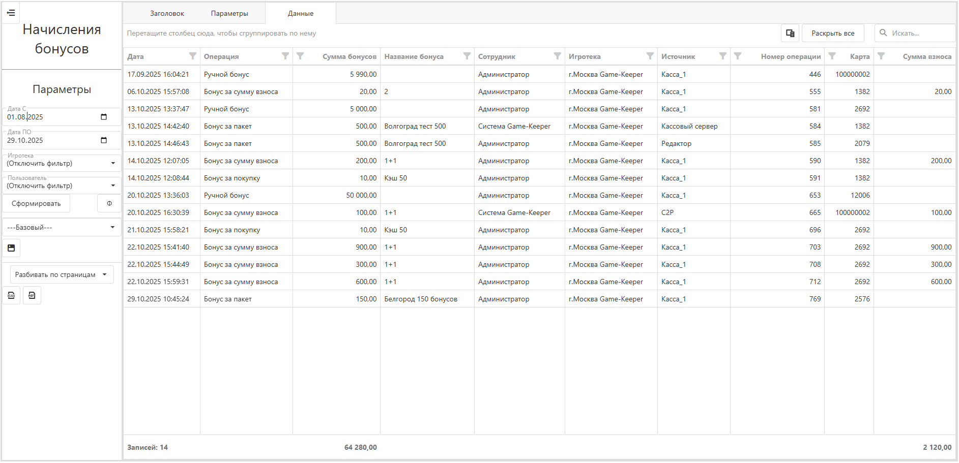 - Игротека — название игрового зала, в котором была проведена операция (по умолчанию столбец скрыт).