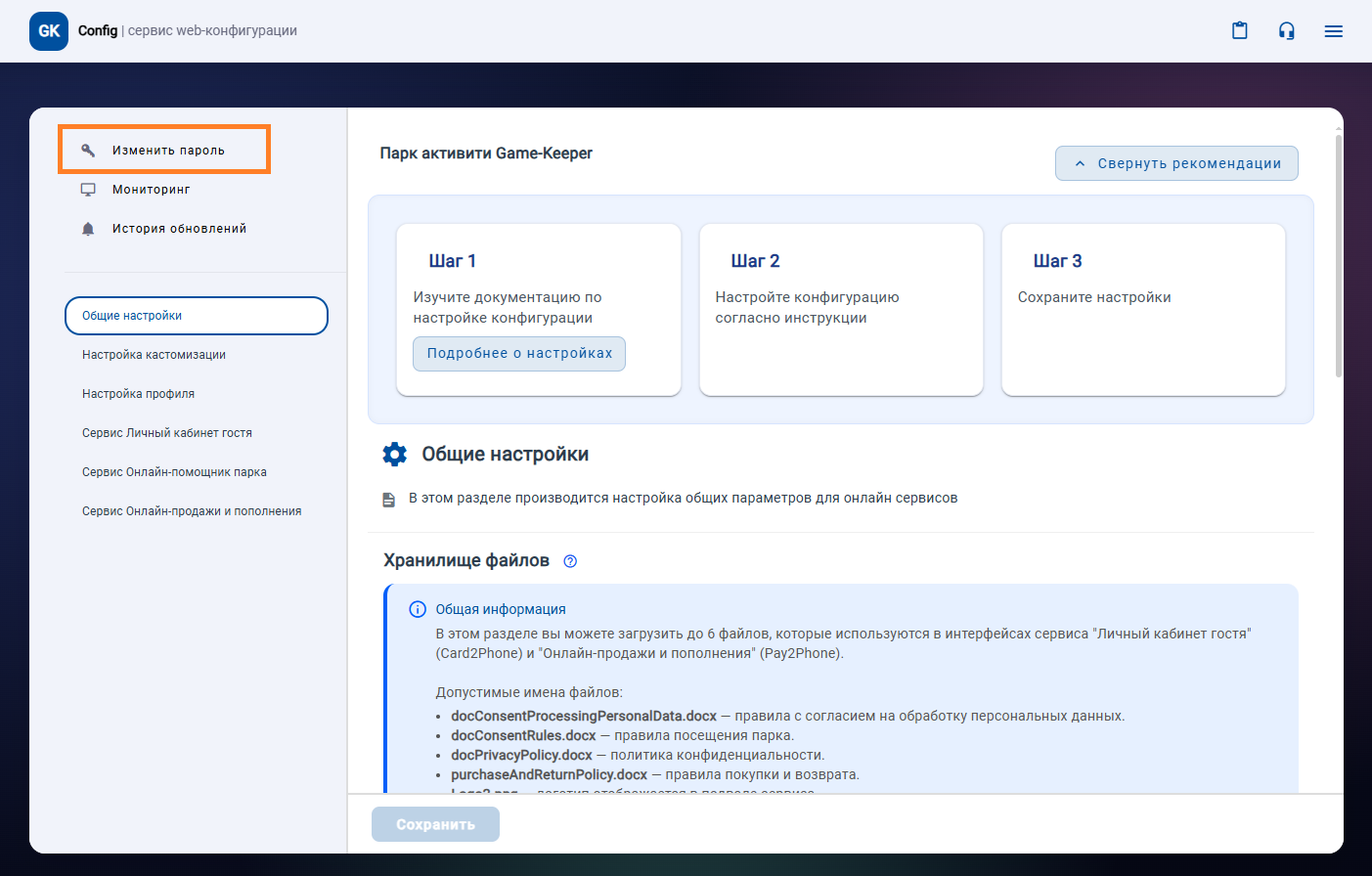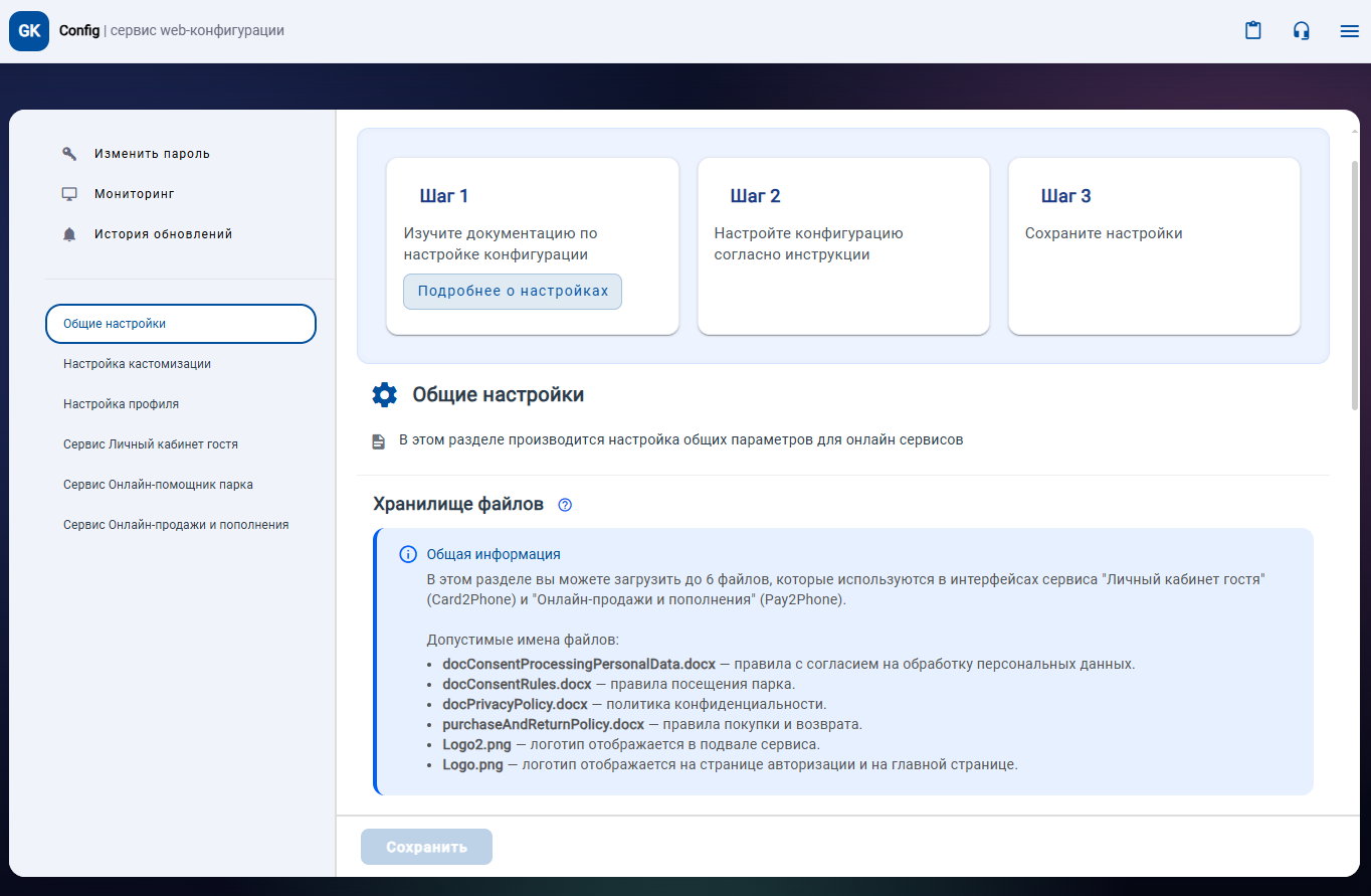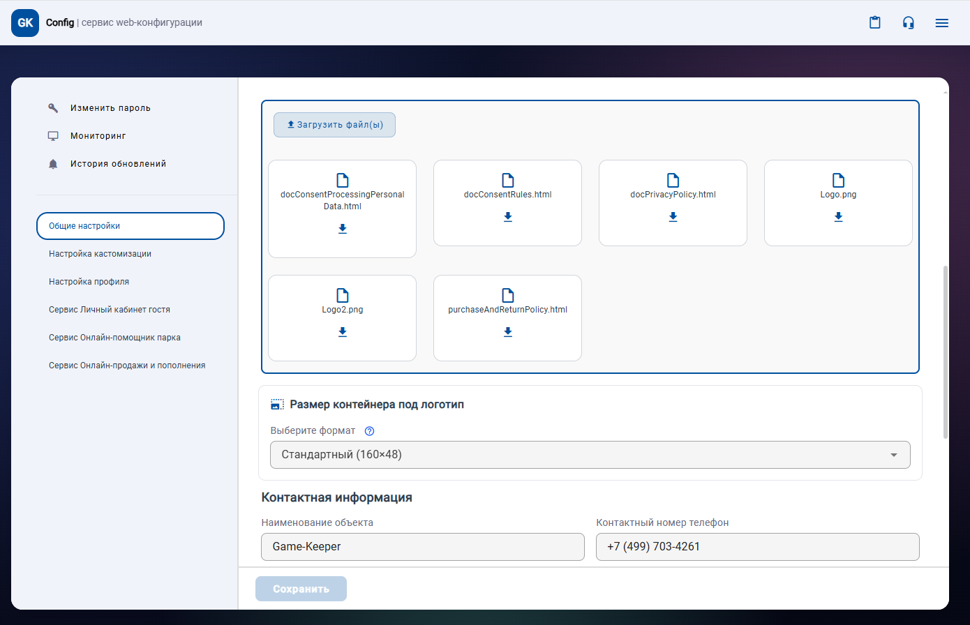 Если у вас не был приобретён сервис Личный кабинет гостя (Card2Phone) и/или сервис Онлайн-продаж и пополнения (Pay2Phone), то блок с хранилищем файлов отображаться не будет.