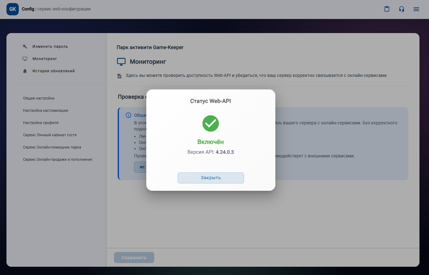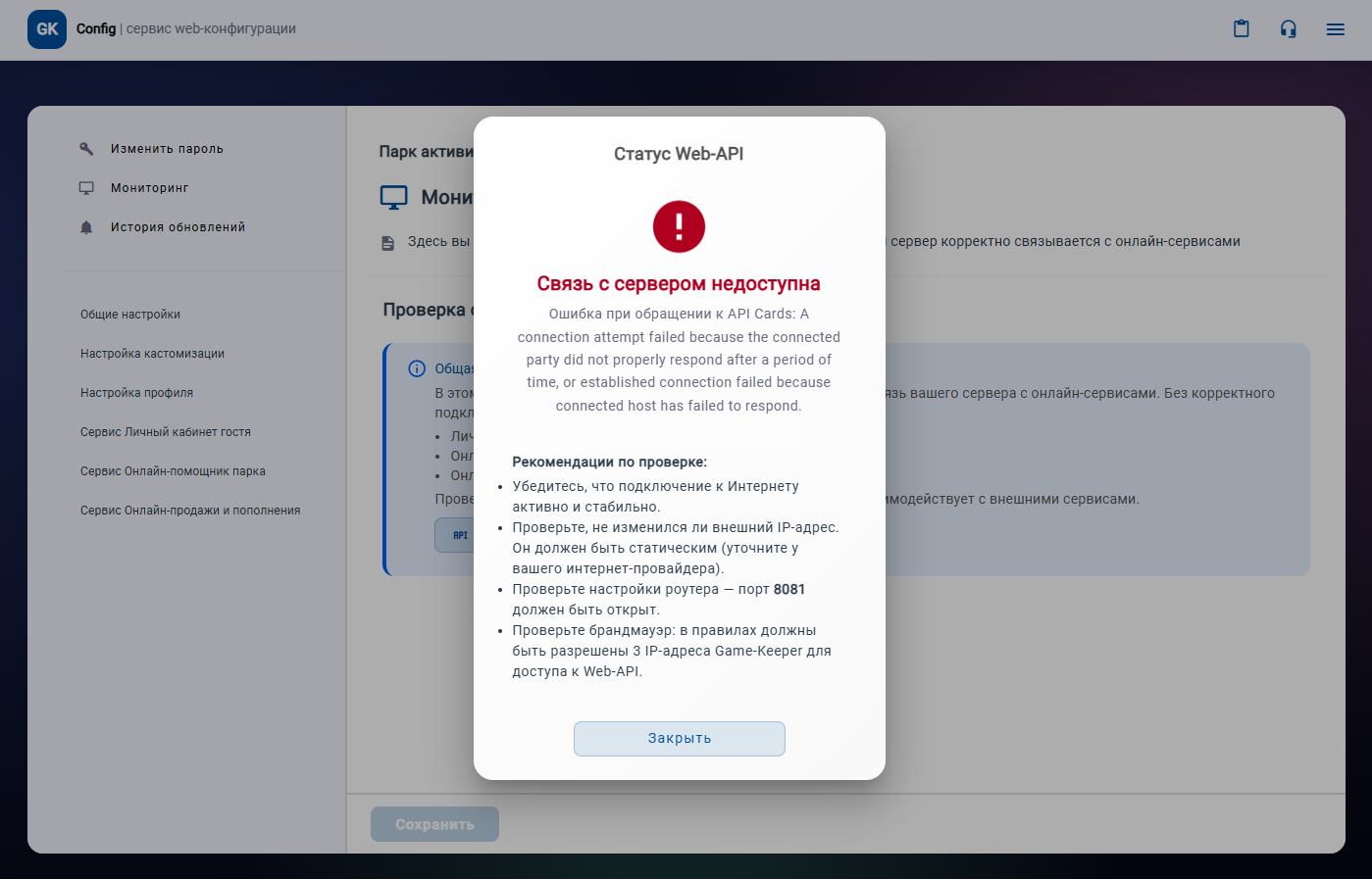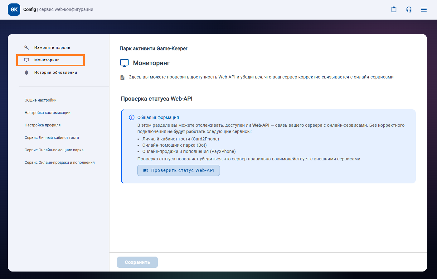 В этом разделе вы можете отслеживать, доступен ли Web-API — связь вашего сервера с онлайн-сервисами. Без корректного подключения не будут работать следующие сервисы: