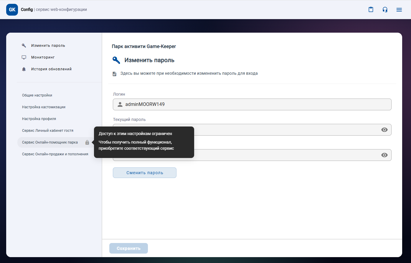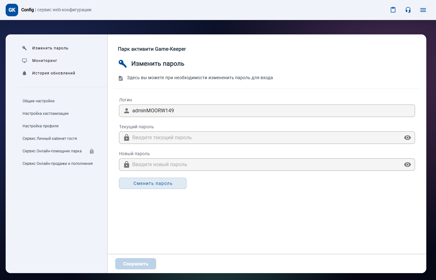 - В меню конфигуратора (на левой панели) выберите пункт «Изменить пароль» (см. Рис. 2).