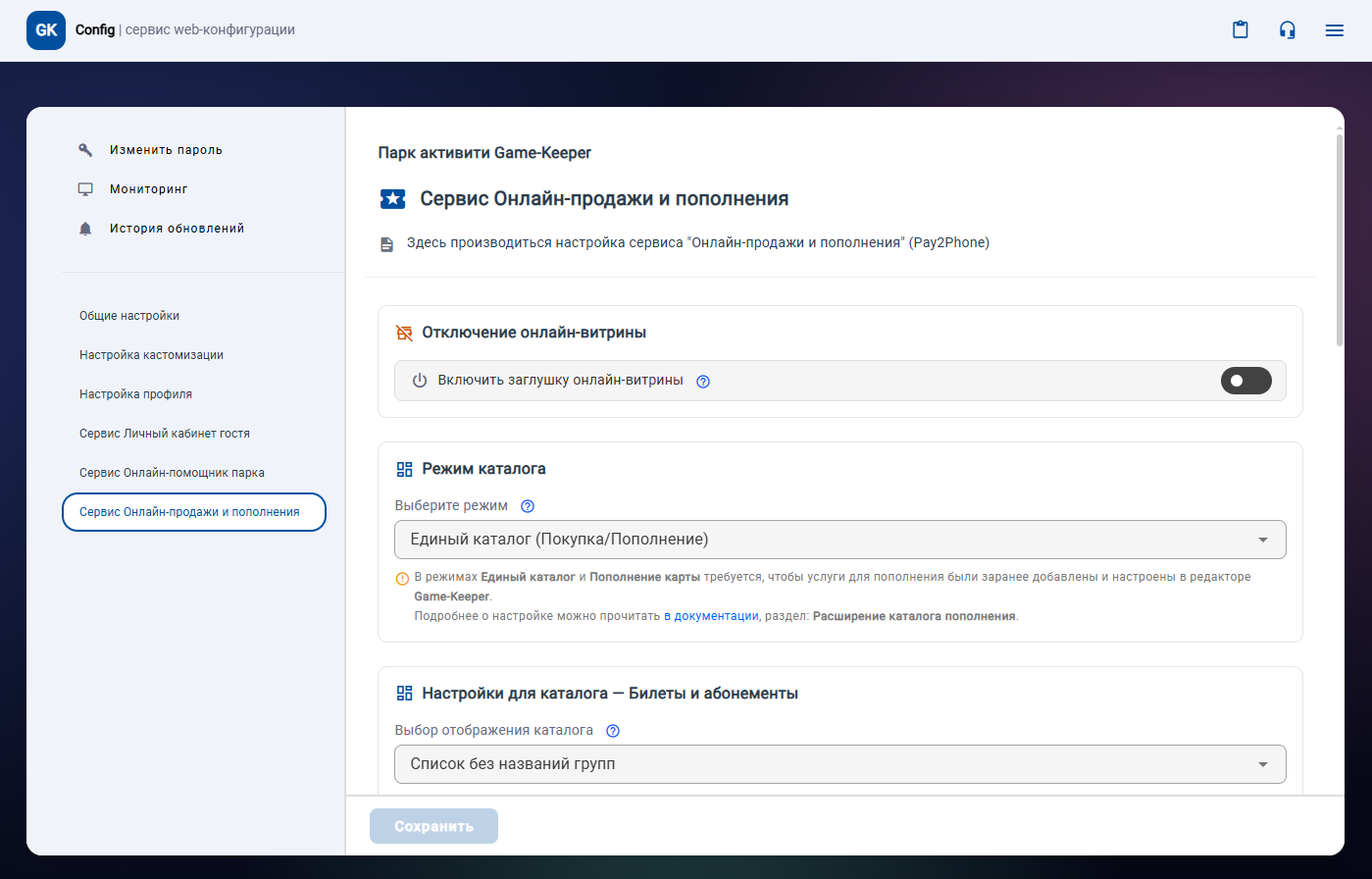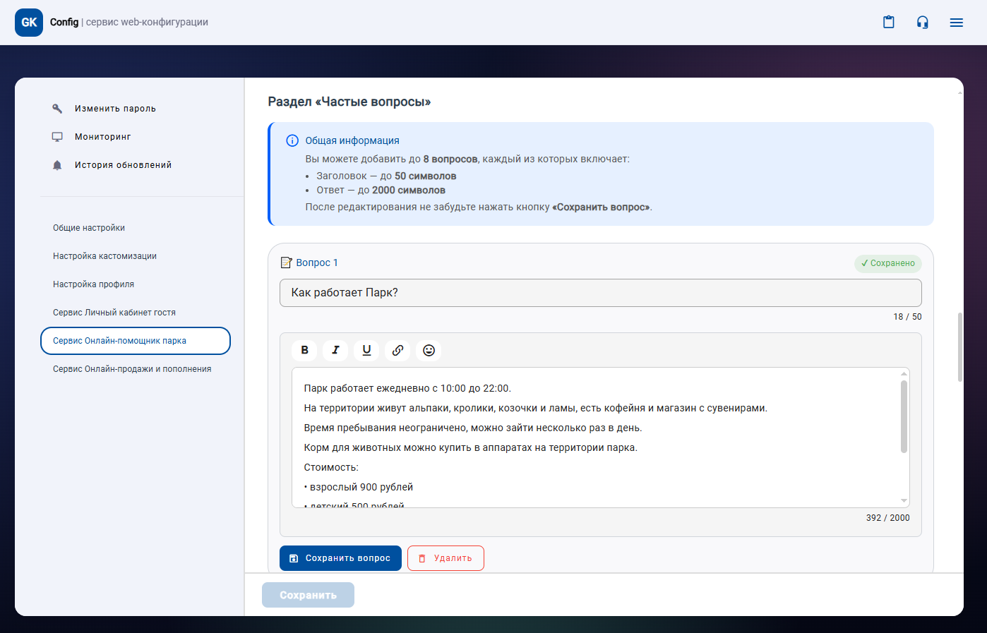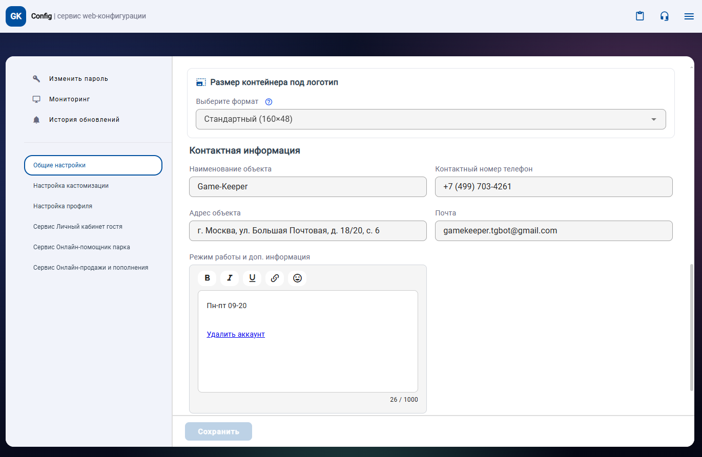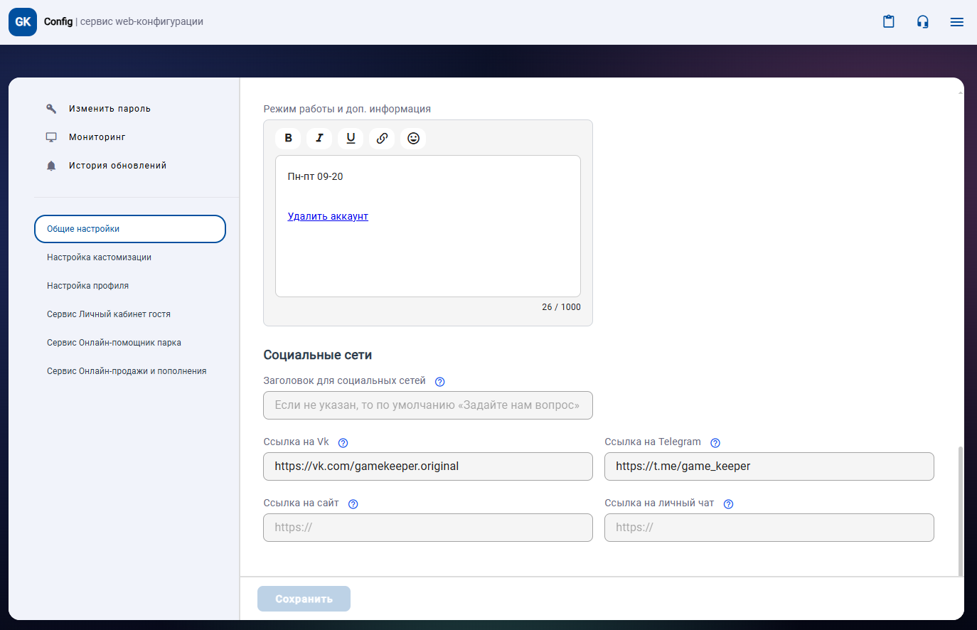 Web-Конфигуратор предназначен для самостоятельной настройки ряда параметров онлайн-сервисов, включая: