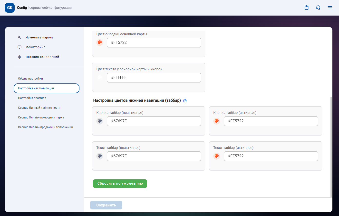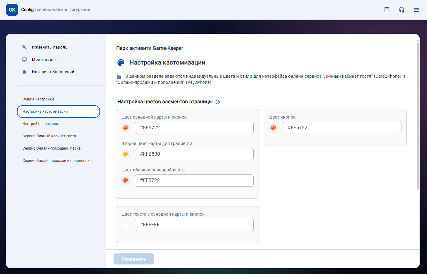 В этом разделе вы можете задать индивидуальные цвета интерфейса для онлайн-сервиса Личный кабинет гостя (Card2Phone) и Онлайн-продажи и пополнения (Pay2Phone).