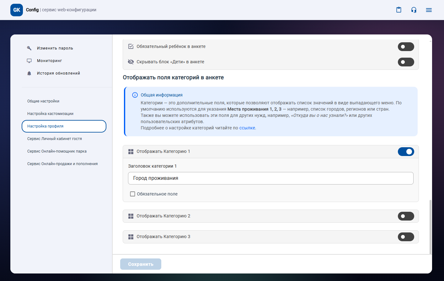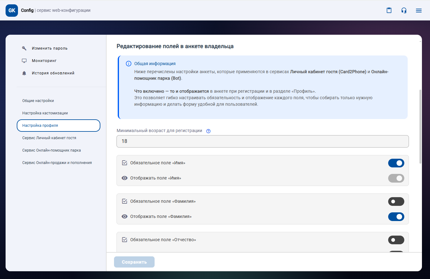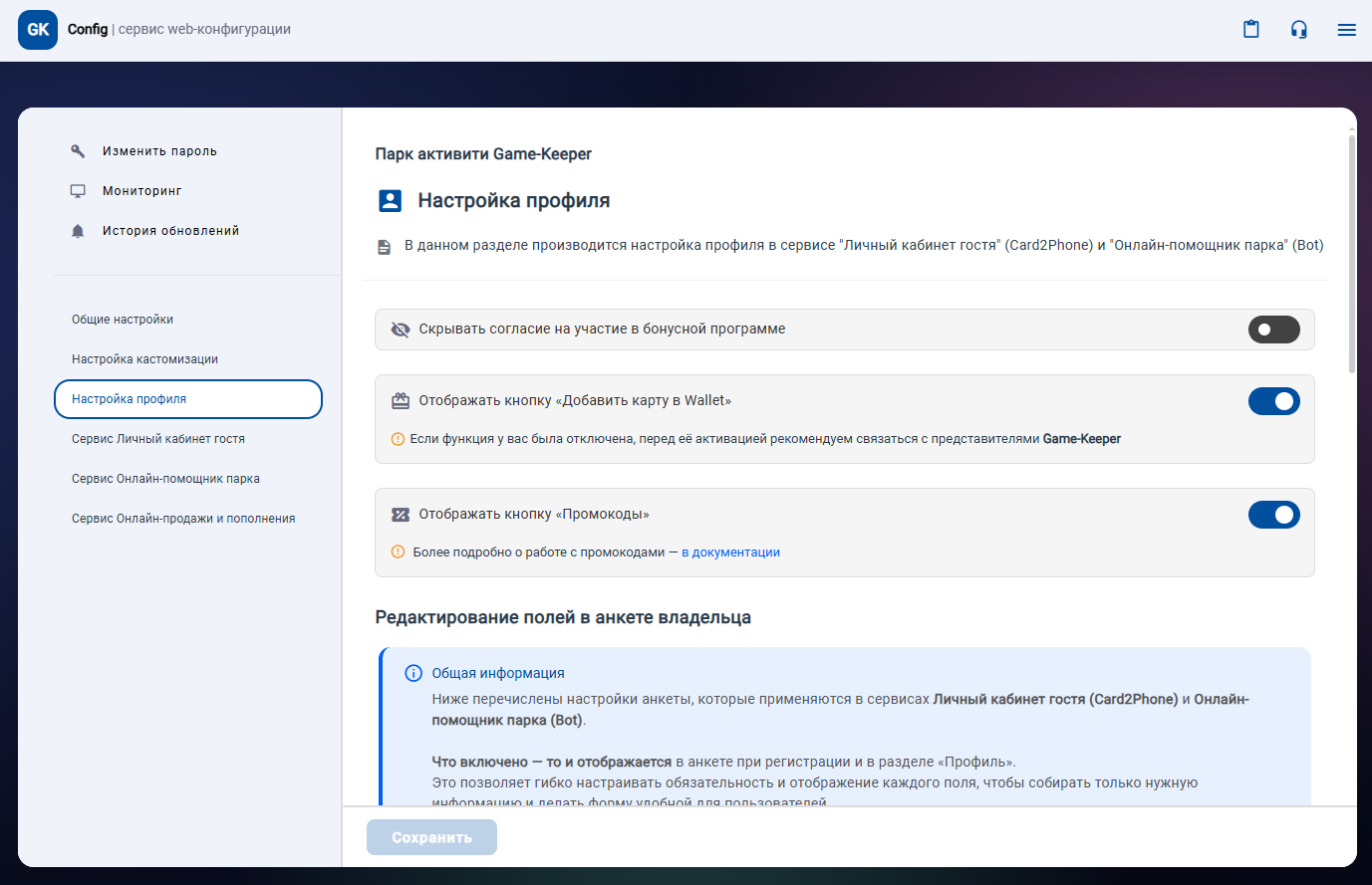 В этом разделе вы можете настроить профиль пользователя в сервисе Личный кабинет гостя (Card2Phone) и Онлайн помощник парка (Bot).
