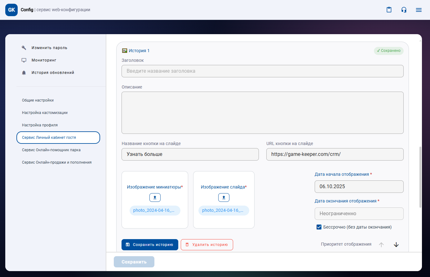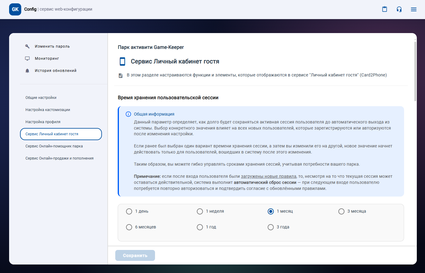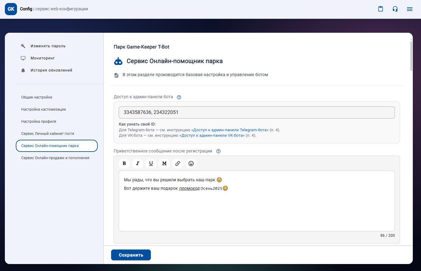 В этом разделе вы можете настроить профиль пользователя в сервисе Личный кабинет гостя (Card2Phone) и Онлайн помощник парка (Bot).