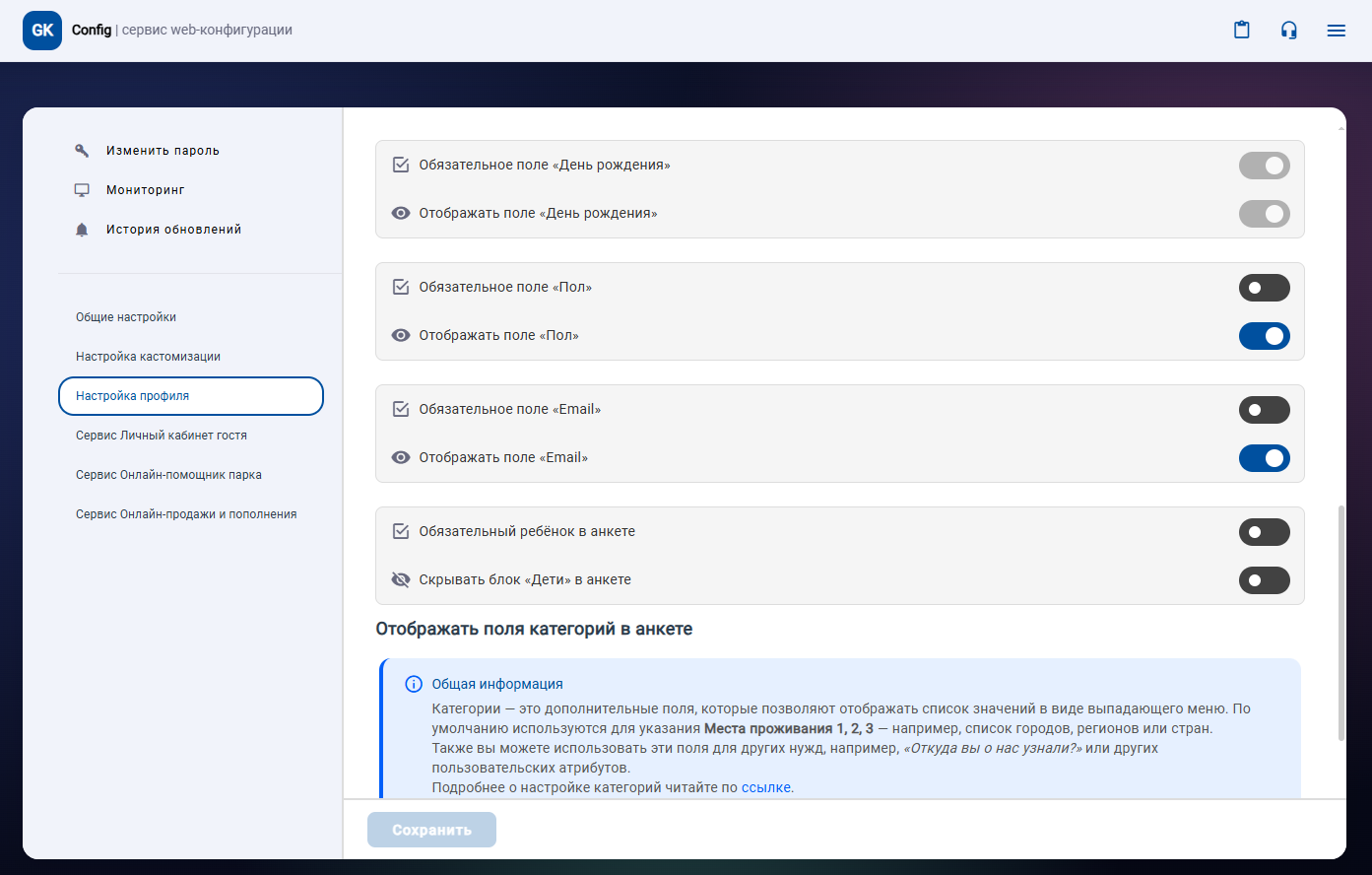 Настройки анкеты влияют на то, какие поля будут видны пользователям при регистрации и в разделе «Профиль».
