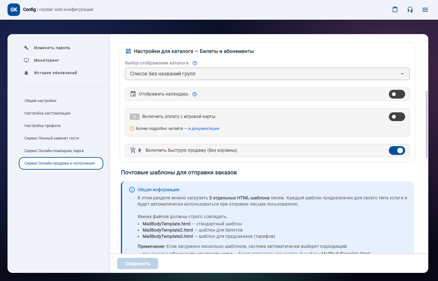 В этом разделе можно загрузить 3 отдельных HTML-шаблона писем. Каждый шаблон предназначен для своего типа услуги и будет автоматически использоваться при отправке письма пользователю.