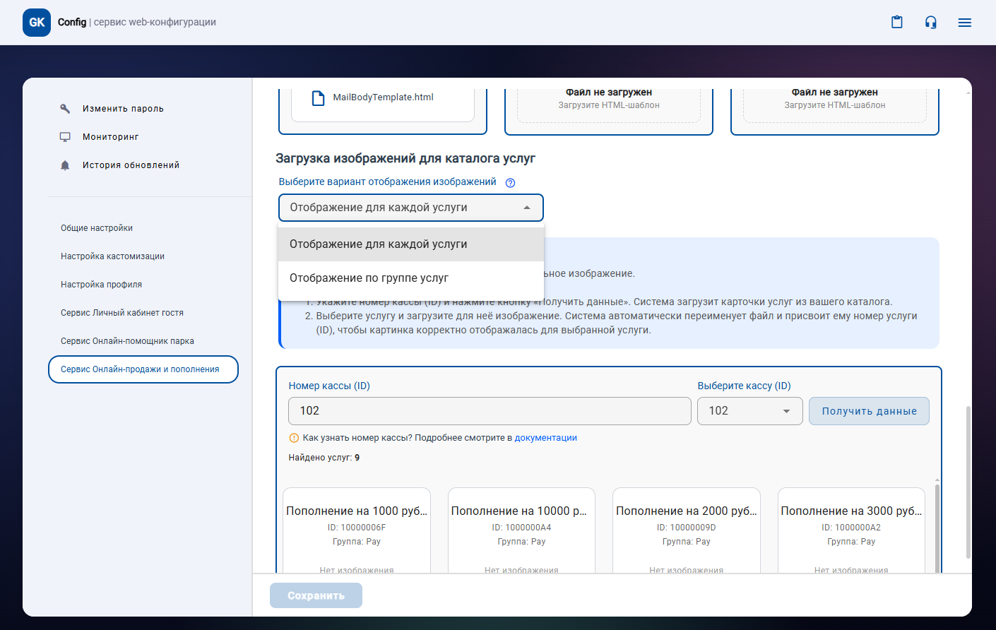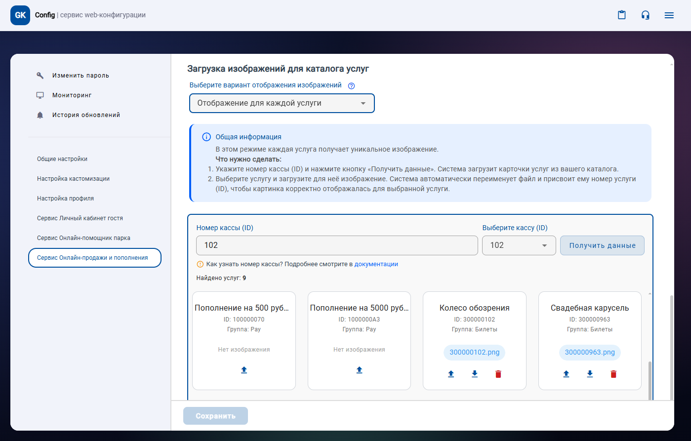 - Выберите услугу и загрузите для неё изображение. Система автоматически переименует файл и присвоит ему номер услуги (ID), чтобы картинка корректно отображалась для выбранной услуги.
