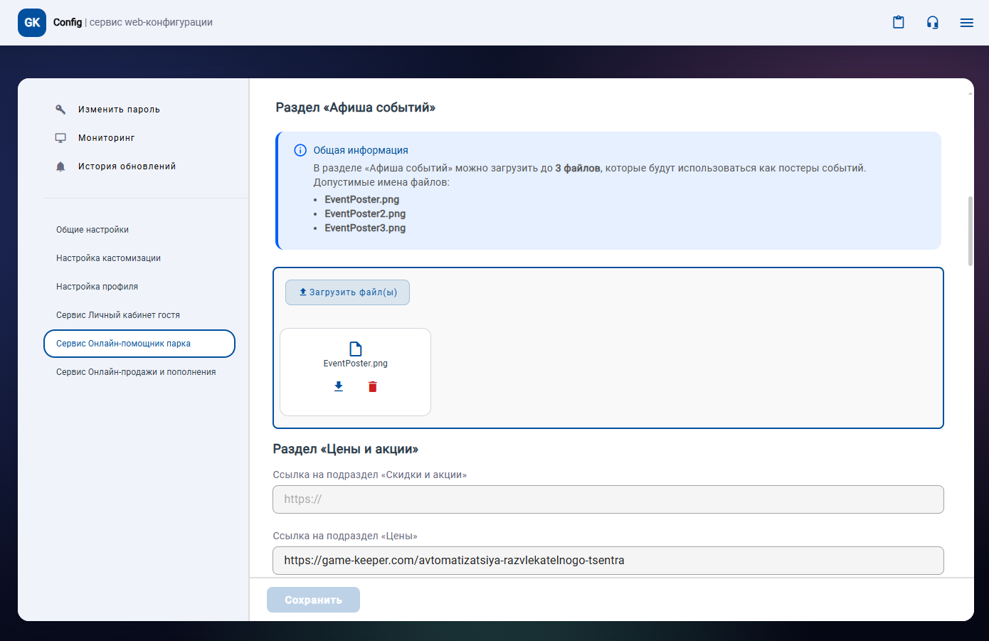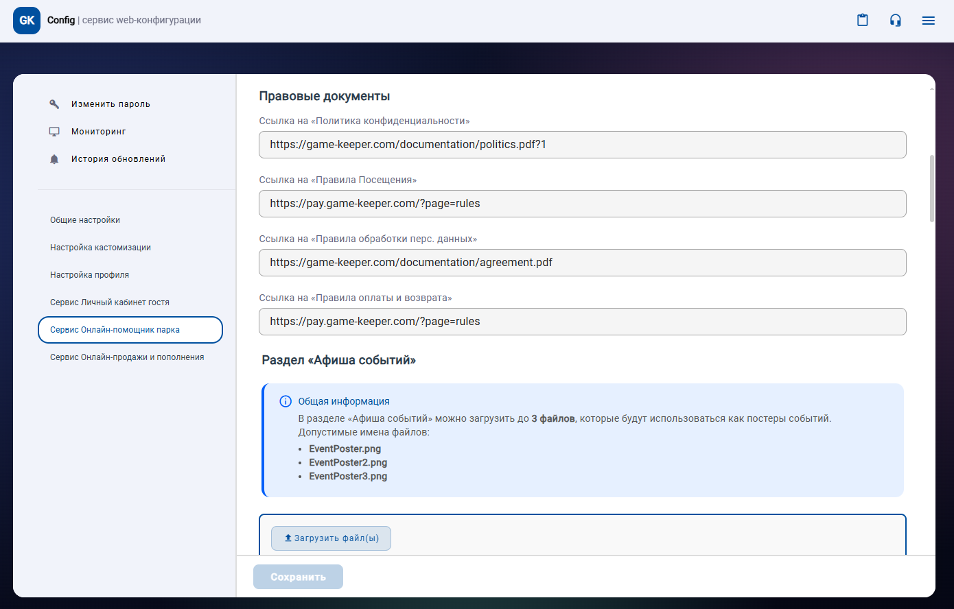 Здесь можно загрузить до 3 файлов, которые будут использоваться как постеры событий.